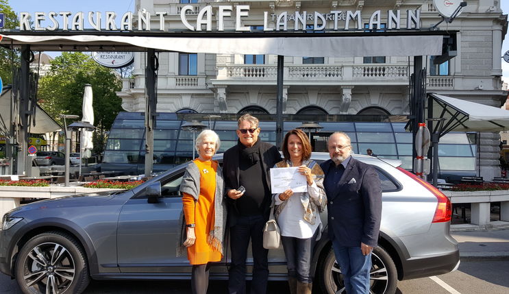 Thomas von Gelmini (VOLVO) und Anita Querfeld gratulierten sehr herzlich. „Was für ein Glück haben wir … wir haben noch nie etwas gewonnen“ - Landtmann-Stammgast Werner Zimmermann und seine Frau freuen sich über den schönen Gewinn. Und über den guten Start in den Tag mit einem feinen Landtmann-Frühstück!